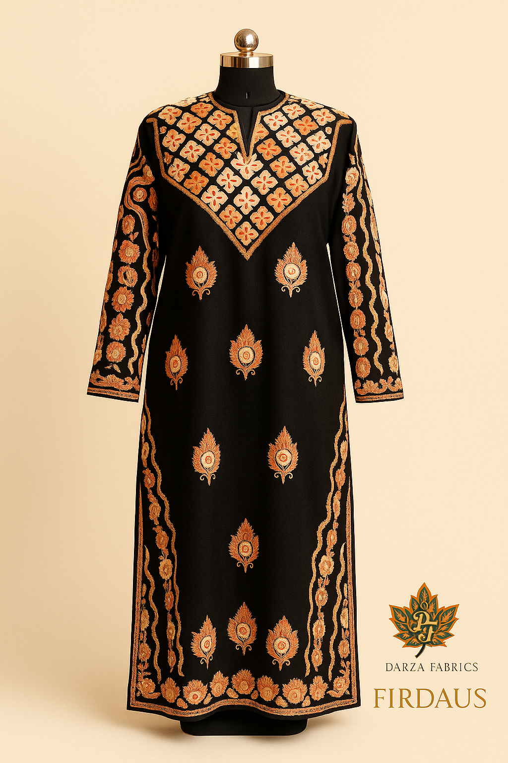 Step into Firdaus — a masterpiece that echoes the splendor of Kashmiri craftsmanship. Crafted in a premium wool-blend base, this pheran is adorned with fine aari embroidery in golden and rust tones, symbolizing timeless heritage. The front yoke is intricately detailed with geometric floral patterns, while the flowing silhouette is framed with delicate border motifs. Effortlessly elegant, Firdaus pairs comfort with sophistication — a statement piece that celebrates the art of slow fashion and the beauty of handwork.