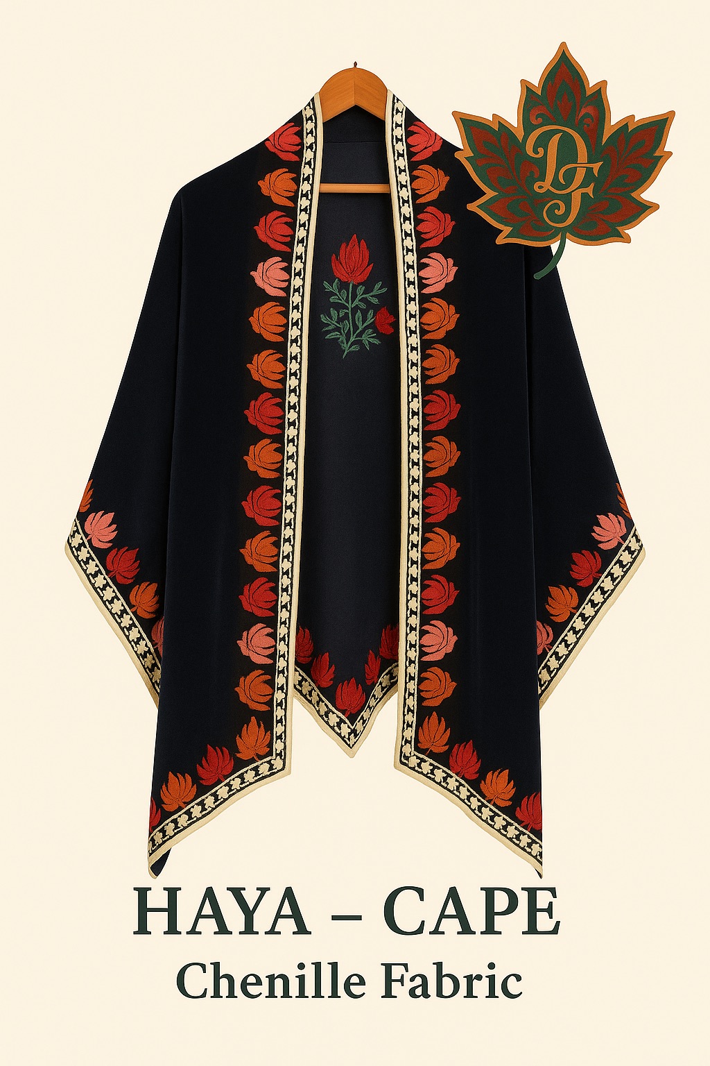 This luxurious chenille cape features exquisite Kashmiri-inspired embroidery, with vibrant florals cascading along the borders — a symphony of autumnal hues on a plush black canvas. The soft, velvety texture and detailed threadwork make it a statement of effortless grace — perfect for festive evenings or elegant layering through winter.