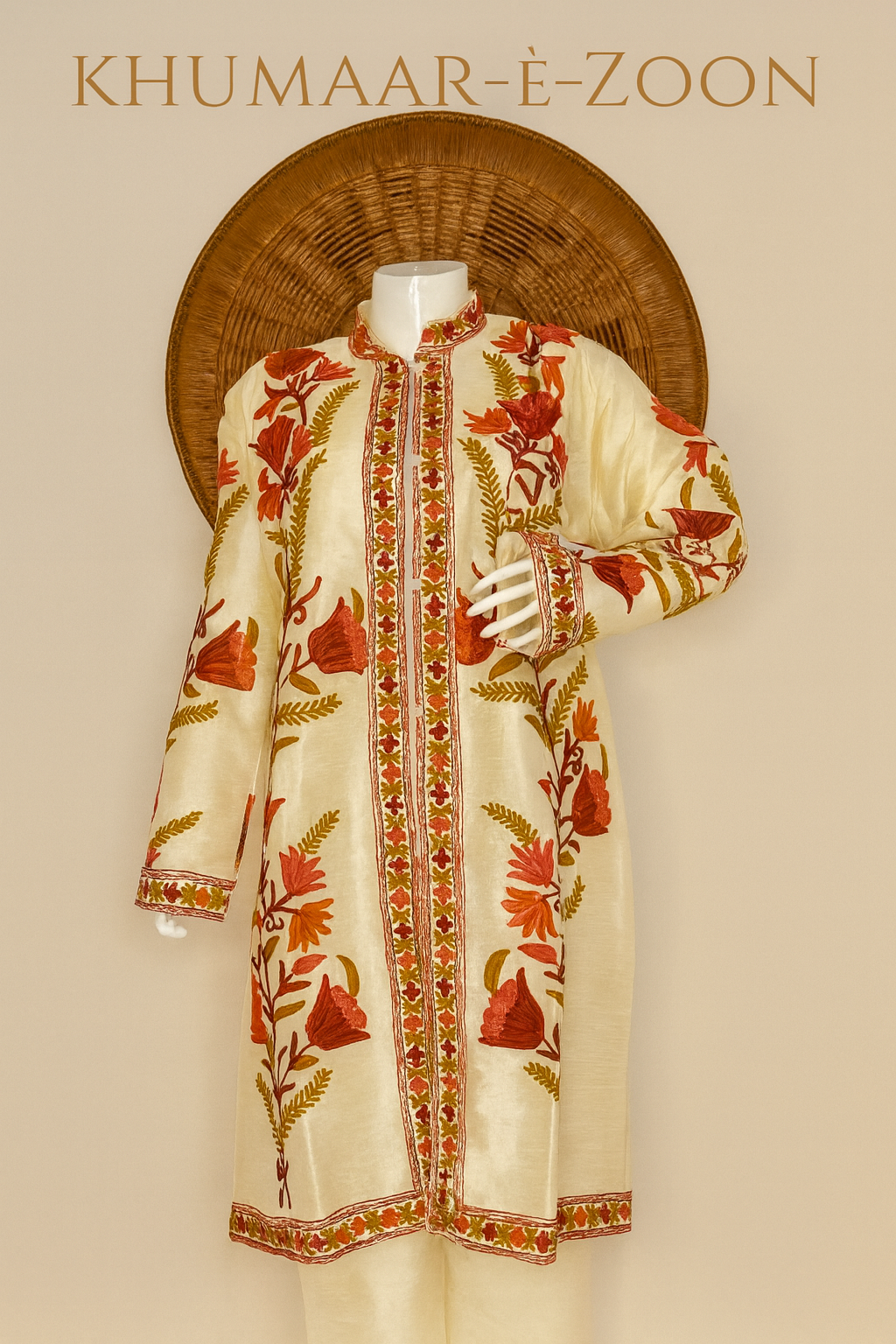 This Kashmiri silk coat captures her spirit — regal yet tender, adorned yet soulful. The intricate embroidery mirrors her poetry, where every flower carries longing and every hue sings of devotion.