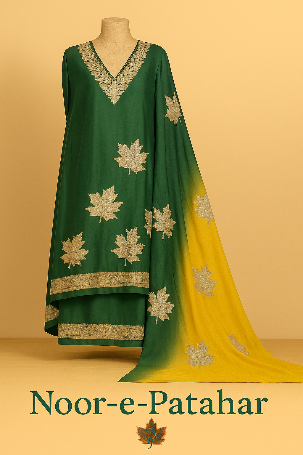 Crafted in fine silk, this exquisite three-piece suit is adorned with intricate tilla embroidery.